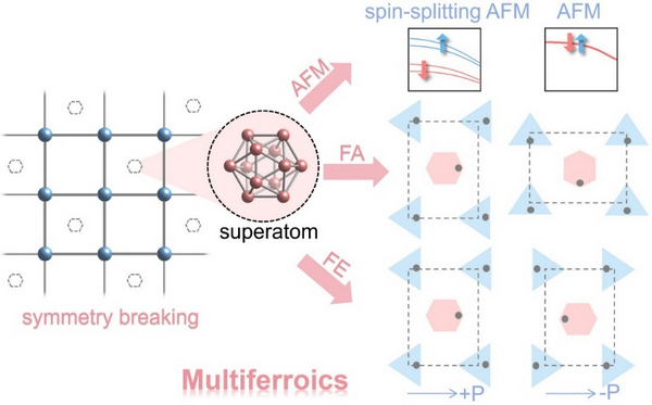 图:在二维晶格中引入超原子可打破中心反演对称性,从而产生自旋劈裂反铁磁性,铁弹性与铁电性的三铁共存。